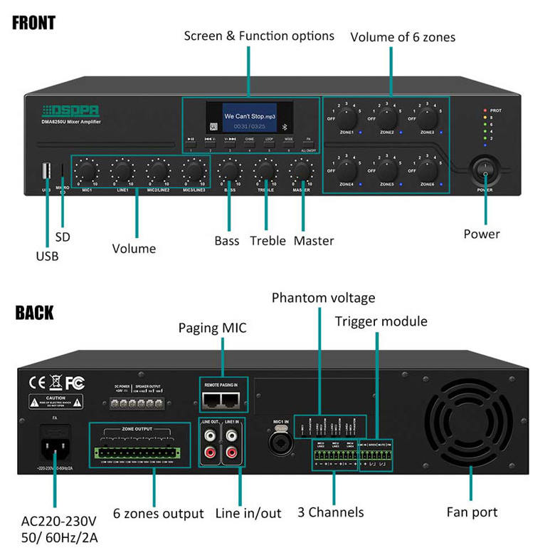 DMA6350U Series Digital Mixer Amplifier can be used in conjunction with the DMA20 Remote Paging Station, supporting 2-channel RJ-45 remote paging microphone. The amplifier has a screen for intuitive display, with such input sources as 4 MIC, 4 AUX, USB, FM, Bluetooth and TF. It also provides protection function when overload, clipping, short circuit and abnormal working temperature occur. It is an amplifier integrating multiple functions to meet users’ demand.