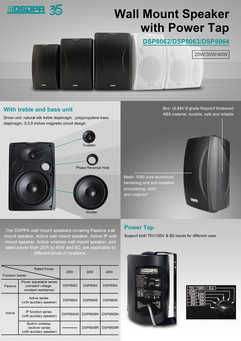DSP8062 (20W) and DSP8064 (40W) Wall Mount Speaker with Power Tap